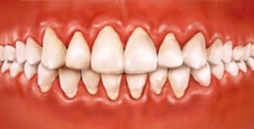 Později vznikají mezi zuby viditelné mezery. Dásně přestávají pevně lnout k zubům, odhalují se zubní krčky a dochází k uvolňování zubů.